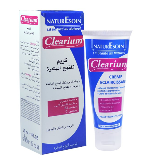 La Crème éclaircissante CLEARIUM conjugue l’action inhibitrice de 2 extraits naturels sur la synthèse de la mélanine avec celle de la vitamine B 3 et de la vitamine C réputées éclaircissantes et unifiantes du teint.