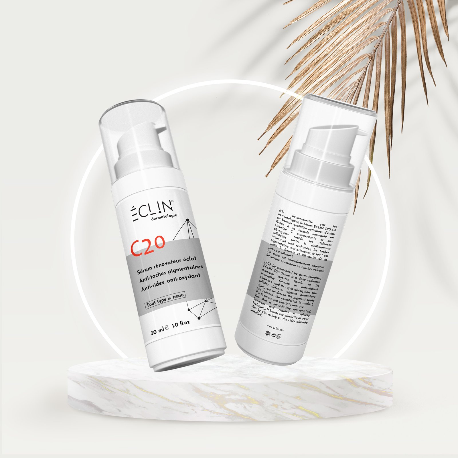 Recommandée par les dermatologues ,le sérum ECLIN C20 est un booster quotidien activateur d’éclat.