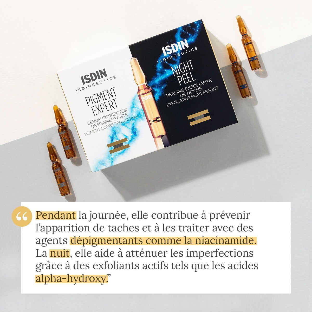 Association de sérum dépigmentant le jour et de peeling exfoliant la nuit