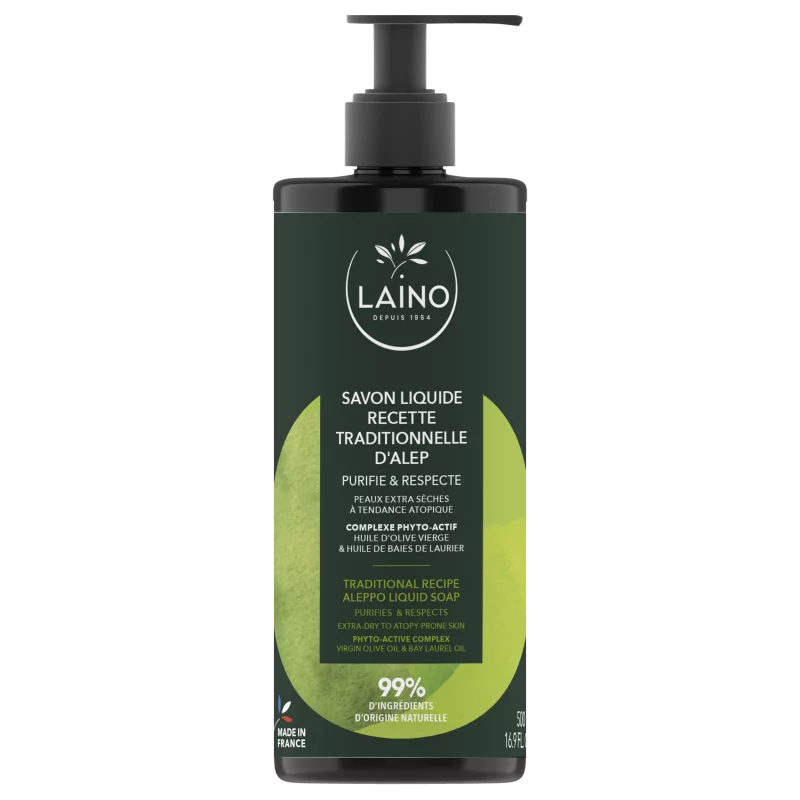 Laino Savon liquide recette tradionnelle d'Alep 500ml fabriqué selon la méthode traditionnelle d’Alep, nettoie en douceur sans dessécher et laisse un film protecteur sur la peau.