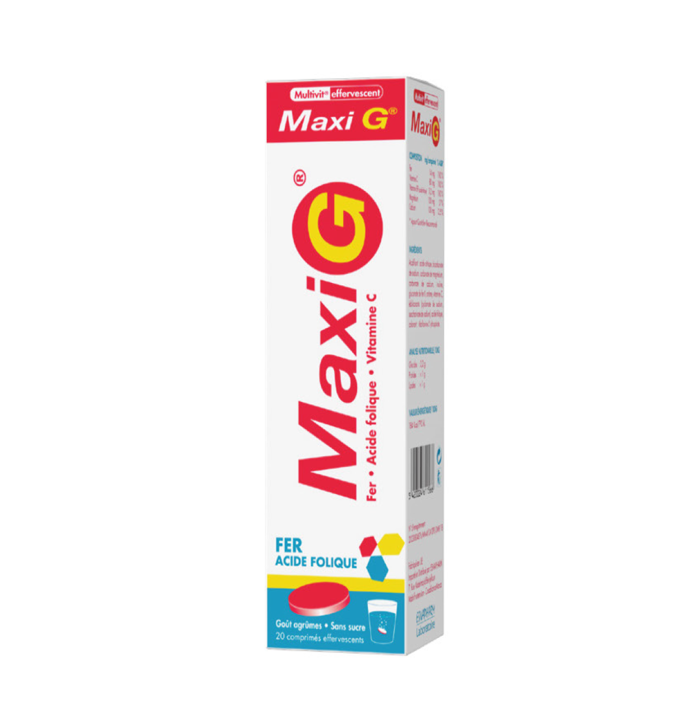 MAXI G est spécialement formulé pour palier à ces besoins, il est destiné à répondre efficacement aux différents troubles d’absorption du fer, causant un déficit pouvant conduire à une anémie ferriprive, ainsi qu’en cas de carences fonctionnelles. Les comprimés effervescents de MAXI G comprennent 100% des AQR* en Fer, minéraux et vitamines essentiels chez l’enfant comme chez l’adulte sans excès de micronutriments pouvant conduire à des effets secondaires.