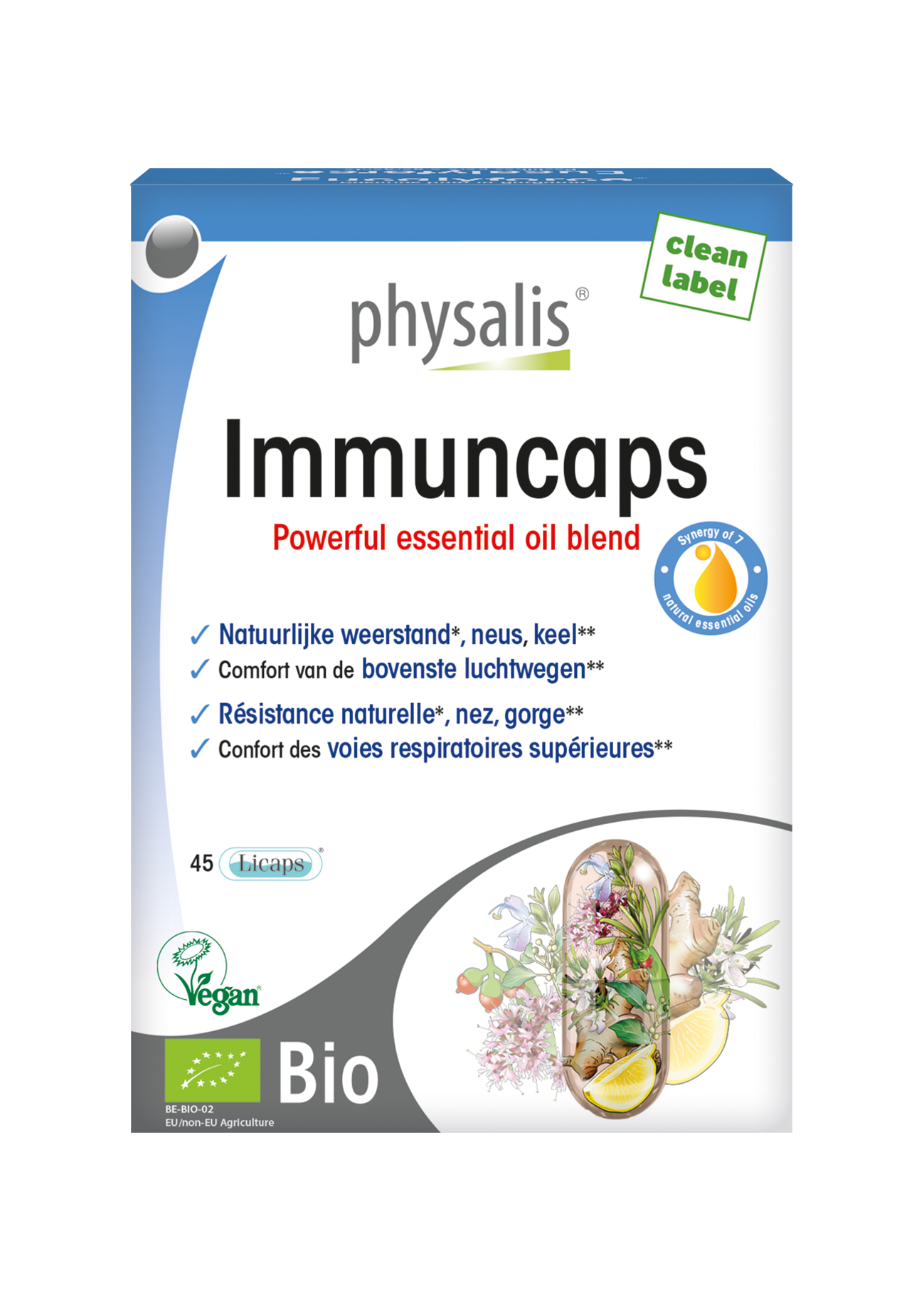 Physalis Immuncaps 45 LICAPS contient une synergie exclusive d’huiles essentielles pures et naturelles, entre autres du ravintsara et de l’Eucalyptus radiata. Les huiles de *romarin, de gingembre et de sarriette des montagnes soutiennent l’immunité naturelle tandis que **l’Eucalyptus radiata contribue au confort des voies respiratoires supérieures.