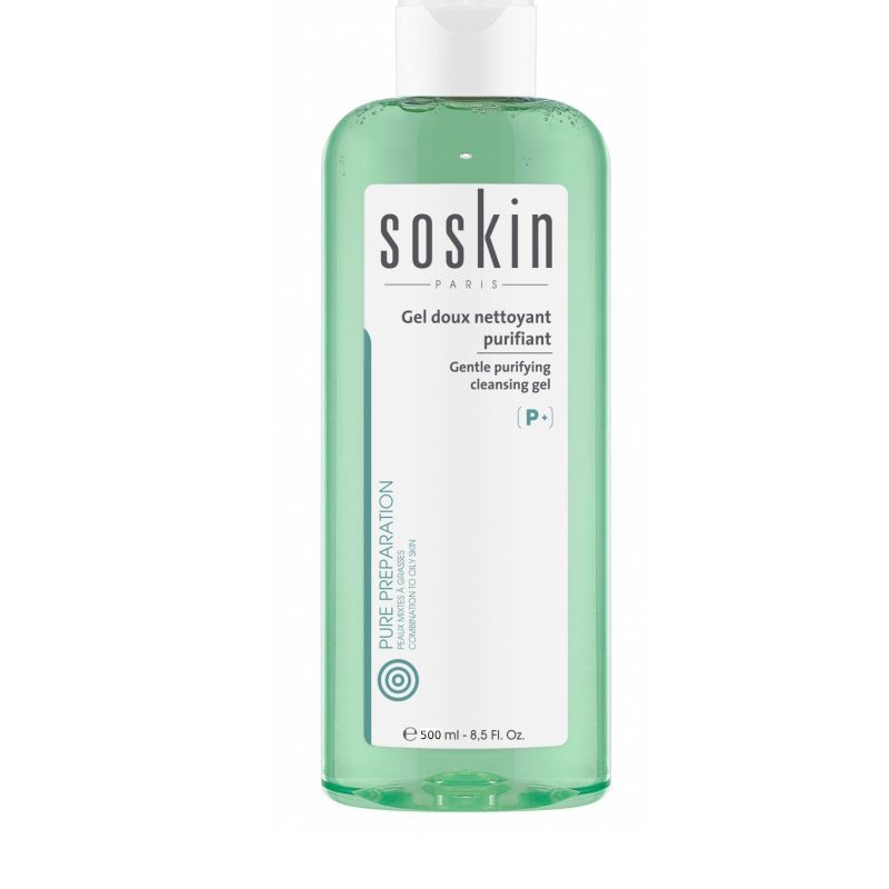 SOSKIN GEL DOUX NETTOYANT PURIFIANT 500 ML nettoie en profondeur sans dessécher la peau, éliminant efficacement les impuretés et l'excès de sébum pour une peau purifiée.