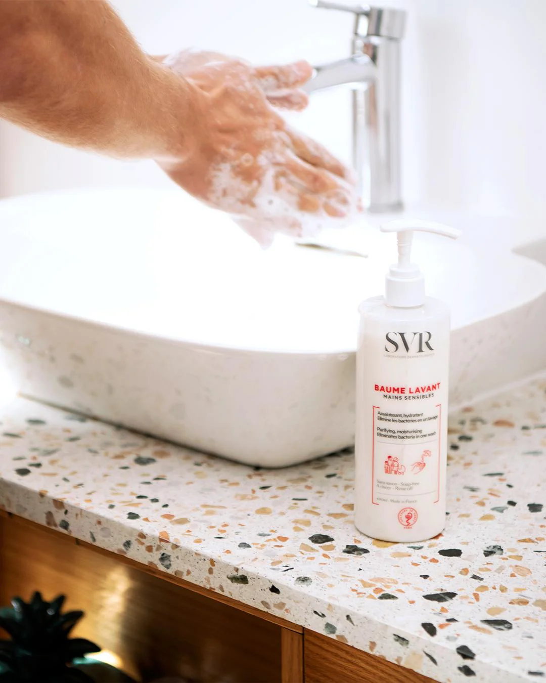 Le lavage fréquent des mains, lorsqu’il est effectué avec des produits inadaptés, peut altérer la barrière lipidique de la peau, la rendant plus fragile. C’est pourquoi SVR a choisi une formule ultra propre et minimaliste pour une efficacité prouvée en un seul lavage :