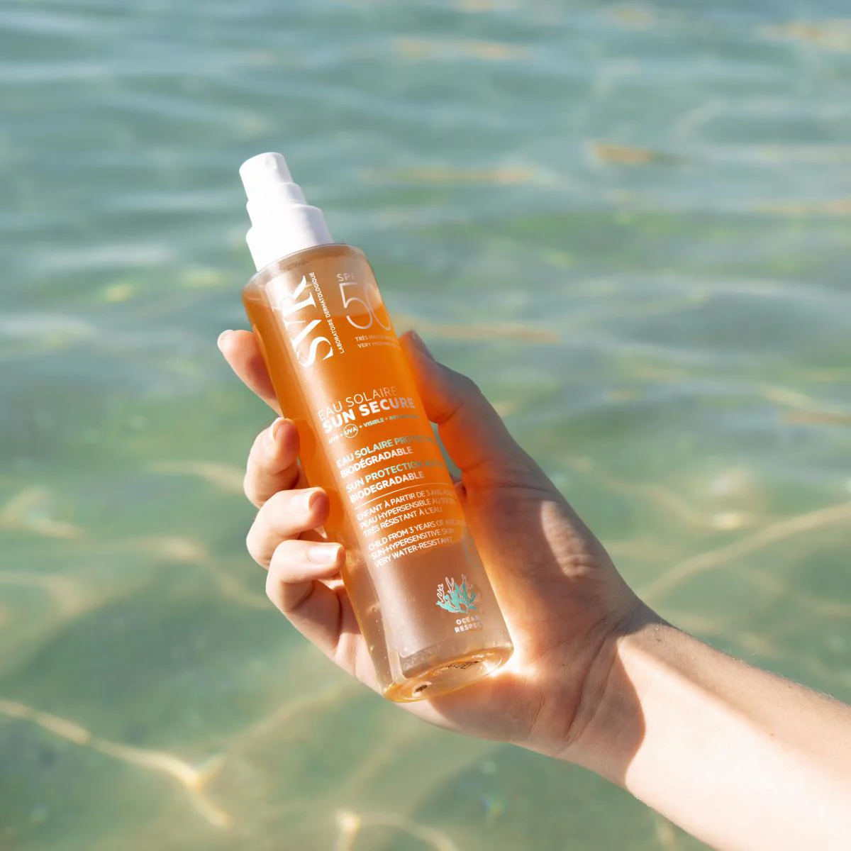 SVR SUN SECURE Eau Solaire SPF50+ Très haute protection au soleil. Adultes et enfants dès 3 ans. Visage et corps. Formule biodégradable respectueuse de l'environnement marin.